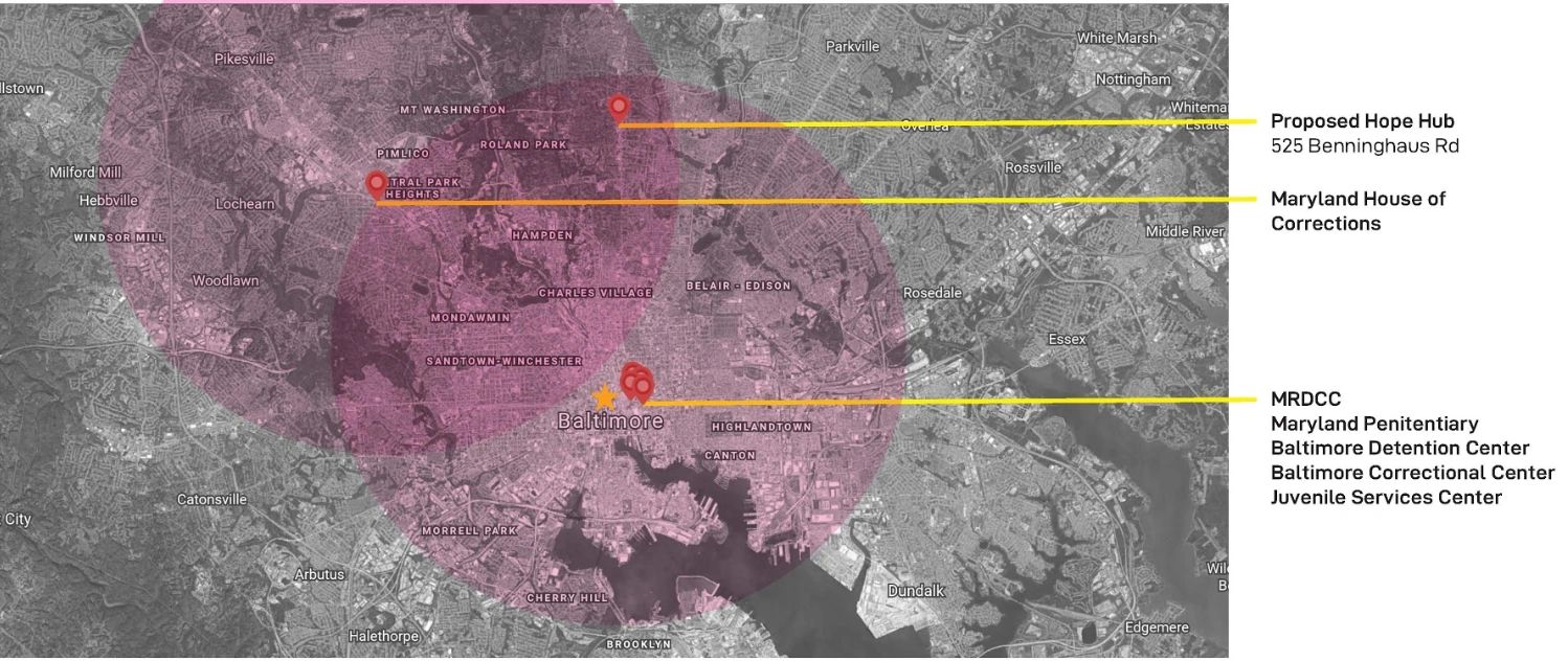 The proposed Hope Hub is geographically near Maryland House of Corrections, Maryland Penitentiary, Baltimore Detention Center, Baltimore Correctional Center and Juvenile Services Center.